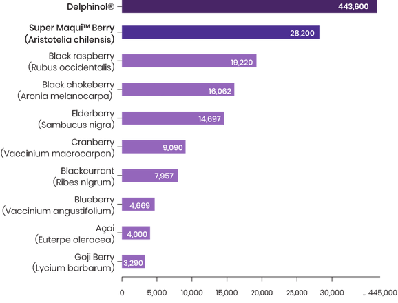 Super Maqui™ (Aristotelia chilensis) is considered to be the most powerful antioxidant superfruit for being rich in polyphenols, anthocyanins, delphinidins, and other nutrients. According to the USDA's ORAC database, the Chilean fruit contains 7x more antioxidant value than acai berries and 9x more than goji berries. The delphinidins in the Super Maqui™ berry are highly effective at neutralizing free-radicals, which are agents that age the body, helping us combat the symptoms that come with aging, and prevents the development of cancer cells.