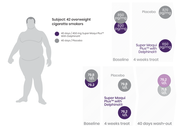 The antioxidant virtues of Super Maqui Plus™ with Delphinol® have been demonstrated in a double-blind, placebo-controlled, cross-over study with 50 overweight cigarette smothers. Subjects received 150 mg Super Maqui Plus™ with Delphinol® capsules three times a day or the equivalent amount of placebo. There was a wash out period of four weeks during which the subjects crossed-over to the opposite regimen.