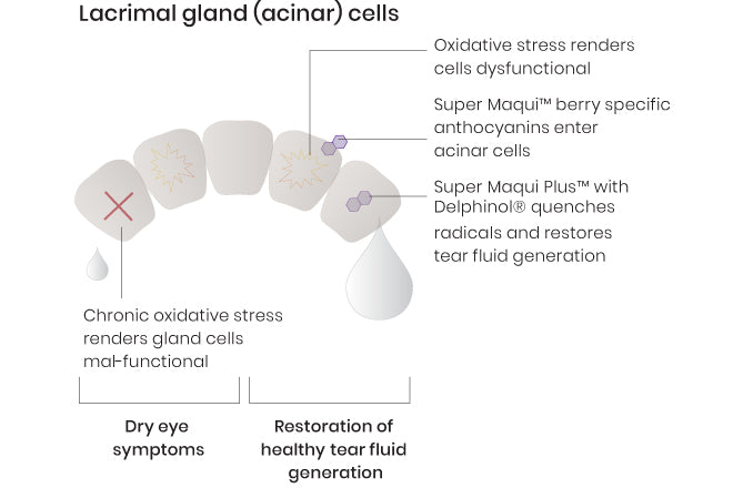 Oxidative stress can hinder tear production by negatively affecting the cells found in the lacrimal gland. A study found that Super Maqui Plus™ with Delphinol® was able to bring nutrients and provide protection to these cells, reversing and preventing inflammatory processes caused by oxidative stress from occuring.